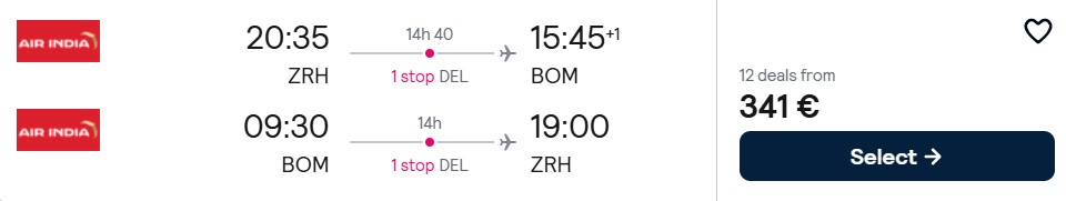 Fliegen Sie mit Air India ab 341 Euro von Zürich zu verschiedenen Zielen in Indien. Verfügbarkeiten gibt es von März bis Mai 2026, es gilt ein Maximalaufenthalt von einem Monat.