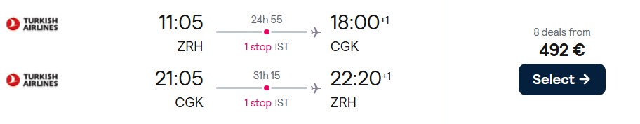 Fliegen Sie mit Turkish Airlines ab 492 Euro in der Economy Class von Zürich nach Jakarta. Verfügbarkeiten gibt es bis Mai 2026. Es gilt ein Mindestaufenthalt von 3 Tagen oder einer Nacht auf Sonntag.
