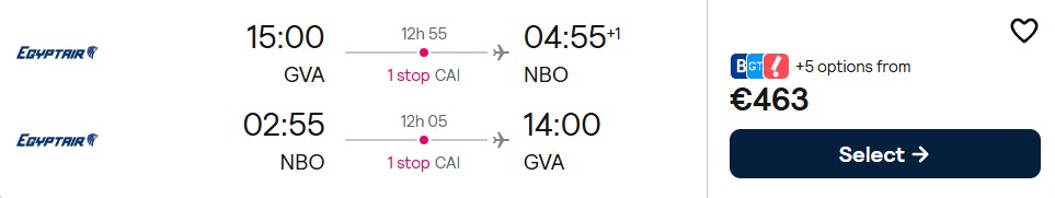 Fliegen Sie mit EgyptAir von Genf nach Nairobi ab 463 Euro. Verfügbarkeiten gibt es im Mai und Juni und zwischen September und Dezember 2026.