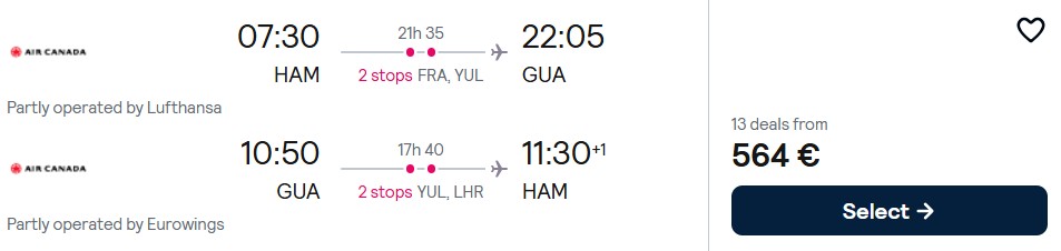 Fliegen Sie mit Air Canada von Deutschland nach Guatemala ab 564 Euro. Verfügbar ist das Angebot im Mai und November 2026 sowie im Januar 2027.