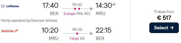 Mit Abflug zwischen Dezember 2025 und April 2026 können Sie mit Lufthansa, Swiss und Austrian Airlines bereits ab 517 Euro von Deutschland nach Mauritius fliegen.