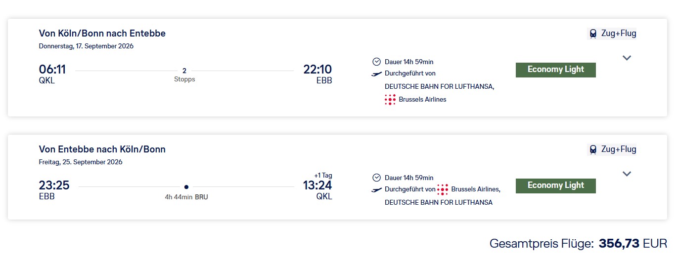 Fliegen Sie mit Brussels Airlines in der Economy Class von Köln nach Entebbe, Kigali oder Nairobi ab 357 Euro. Per Bahn-Zubringer geht es zuerst nach Brüssel und dann weiter nach Ostafrika. Verfügbarkeiten gibt es von September 2026 bis Januar 2027, es gilt ein Mindestaufenthalt von 6 Tagen oder eine Nacht auf Sonntag.