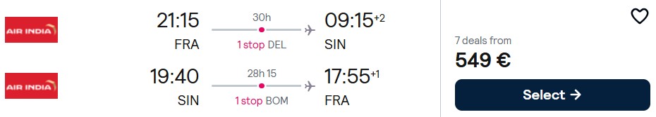 Fliegen Sie mit Air India von Frankfurt nach Singapur ab 549 Euro. Verfügbarkeiten gibt es im Mai und Juni 2026.