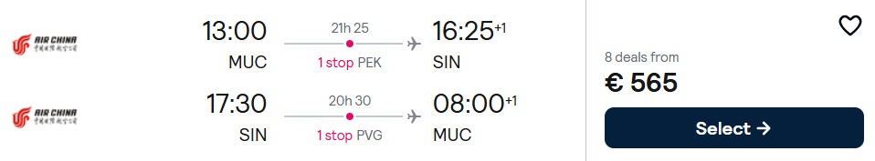 Fliegen Sie mit Air China von Frankfurt und München nach Singapur ab 565 Euro. Verfügbarkeiten gibt es von Ende April bis Juni 2026.
