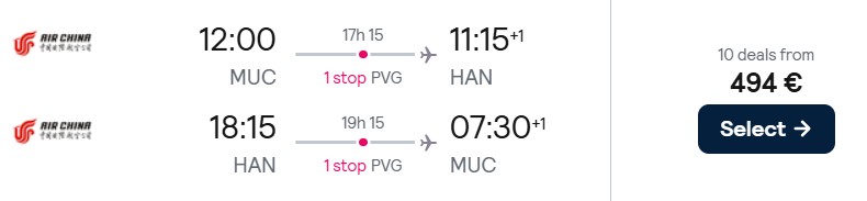 Bis zum 10. Dezember verkauft Air China günstigere Economy Class Tickets von München und Frankfurt nach Hanoi. Verfügbarkeiten gibt es bis Dezember 2025. Es gelten ein Mindestaufenthalt von 3 Tagen und ein Maximalaufenthalt von 3 Monaten.