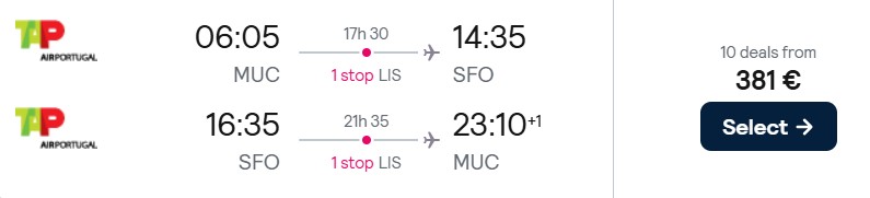 Fliegen Sie mit TAP Air Portugal in der Economy Class von Deutschland und der Schweiz nach San Francisco und Los Angeles ab 381 Euro. Verfügbarkeiten gibt es bis Mitte Dezember 2025.
