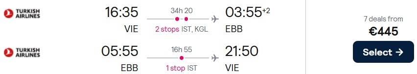 Turkish Airlines bietet aktuell preiswerte Flüge ab Wien nach Entebbe an. Die Verfügbarkeiten erstrecken sich von Februar bis Oktober 2026. Die Preise starten schon bei 445 Euro.