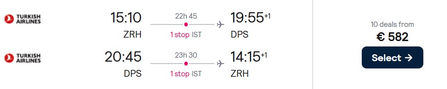 Fliegen Sie mit Turkish Airlines in der Economy Class von Zürich und Wien nach Bali ab 582 Euro. Verfügbarkeiten gibt es von April bis Juni sowie von September bis Dezember 2026.