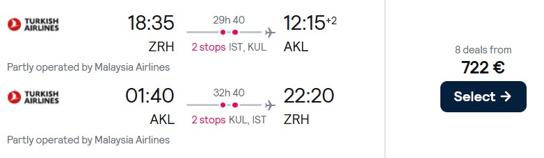 Fliegen Sie mit Turkish Airlines in der Economy Class von Basel, Zürich und Wien nach Auckland ab 722 Euro. Verfügbarkeiten gibt es im Mai und Juni sowie im Oktober 2026. Den genannten Preis haben wir vom 25. Oktober bis zum 08. November 2026 gefunden.