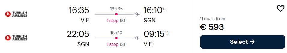 Fliegen Sie mit Turkish Airlines in der Economy Class von Wien nach Hanoi oder Ho Chi Minh Stadt ab 593 Euro. Verfügbarkeiten gibt es von April bis Juni 2026.