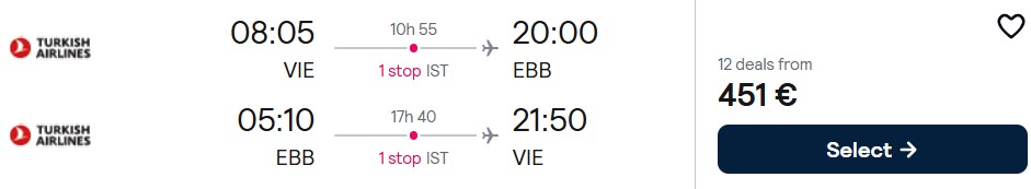 Fliegen Sie mit Turkish Airlines in der Economy Class von Wien und Zürich nach Entebbe in Uganda ab 451 Euro. Verfügbarkeiten gibt es zwischen April und Dezember 2026, ausgenommen im Juli. Es gilt ein Mindestaufenthalt von 3 Tagen oder einer Nacht auf Sonntag.
