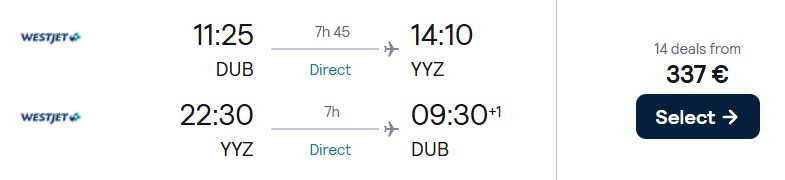 Reisen Sie mit WestJet bereits ab 337 Euro nonstop von Dublin nach Toronto. Verfügbar ist das Angebot für Abflüge im März 2026.