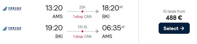 Ab Amsterdam und Frankfurt geht es mit China Southern Airlines in der Economy Class preiswert nach Borneo. Verfügbarkeiten gibt es im Mai und Juni 2026, die Preise starten bei 488 Euro.