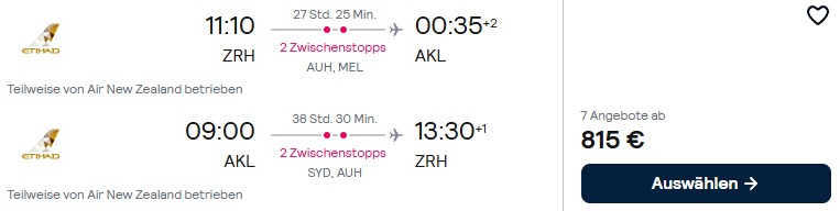 Etihad Airways verkauft im Moment besonders günstige Economy Class Flüge von Zürich über Abu Dhabi und Melbourne oder Sydney nach Auckland. Der Reiseantritt ist ohne große tarifliche Beschränkungen bis zum 30. Juni 2026 möglich. Die Dauer des Sales ist unbekannt und der genannte Preis wurde vom 17. Juni bis zum 24. Juni 2026 gefunden.
