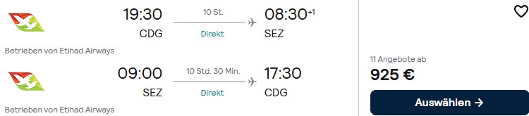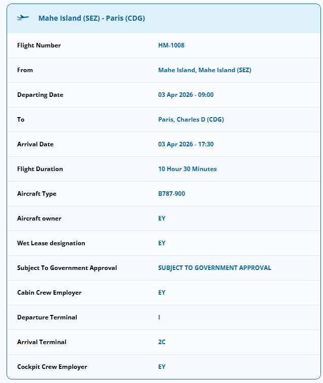Air Seychelles bietet derzeit attraktive Nonstopflüge von Paris auf die Seychellen an. Zum Einsatz kommen dabei Langstreckenflugzeuge vom Typ Dreamliner, die von Etihad Airways stammen. Diese Flüge sind bis voraussichtlich Ende April 2026 buchbar und der genannte Preis wurde vom 8. April bis zum 22. April 2026 gefunden.