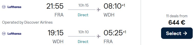 Fliegen Sie nonstop mit Lufthansa und Discover Airlines ab 644 Euro von München oder Frankfurt nach Windhoek in Namibia. Verfügbarkeiten gibt es von Dezember 2025 bis Juli 2026.