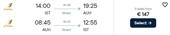 Mit Abflug in Istanbul lassen sich im Moment sehr günstige Etihad Airways Economy Class Flüge nach Abu Dhabi buchen. Verfügbarkeiten gibt es ohne Beschränkungen bei Abflug zwischen Mitte Februar und Anfang März 2026. Diese Flüge buchen in der Buchungsklasse E ein und der genannte Preis wurde vom 19. Februar bis zum 27. Februar 2026 gefunden.