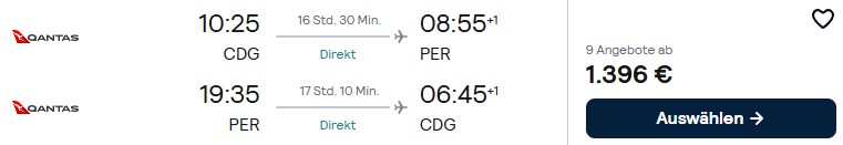 Qantas verkauft bis 02. April ermäßigte Economy Class Direktflüge von Paris nach Perth. Verfügbarkeiten gibt es bei Abflug zwischen Mitte August und Ende November und ab Ende Januar 2027 und es gelten als tarifliche Einschränkungen ein Mindestaufenthalt von 5 Tagen und ein Maximalaufenthalt von 4 Monaten. Diese Flüge buchen in der Buchungsklasse N ein und der genannte Preis wurde vom 24. September bis zum 07. Oktober 2026 gefunden.