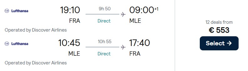 Fliegen Sie mit Lufthansa und Discover Airlines in der Economy Class nonstop von Frankfurt auf die Malediven ab 553 Euro. Verfügbarkeiten gibt es im Januar und Februar 2026.