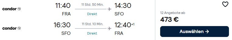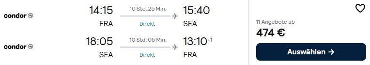 Bei Condor können Sie aktuell sehr günstige Economy Class Direktflüge von Frankfurt nach San Francisco und nach Seattle buchen. Flüge zu diesen und ähnlich günstigen Preisen finden Sie bei Abflug zwischen Ende August und Mitte Oktober 2026. Handgepäck ist inkludiert, aufgegebenes Gepäck ist zusätzlich zu bezahlen.