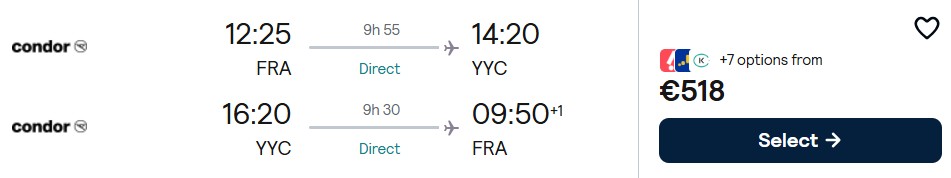 Mit Condor fliegen Sie im Mai und Juni 2026 preiswert und nonstop von Frankfurt nach Calgary. Die Preise starten bei 518 Euro, der Tarif beinhaltet nur Handgepäck.