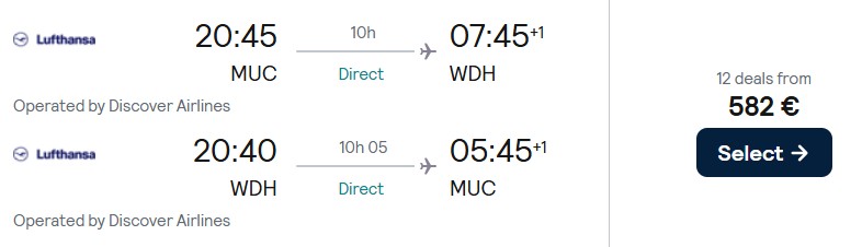 Fliegen Sie nonstop mit Discover Airlines von München und Frankfurt nach Windhoek in Namibia ab 582 Euro. Verfügbarkeiten gibt es von Februar bis April sowie im Juni 2026.