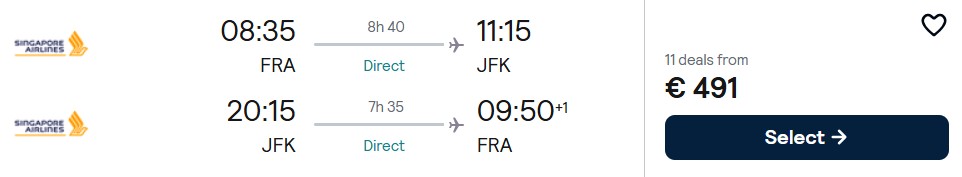 Fliegen Sie mit Singapore Airlines nonstop in der Economy Class von Frankfurt nach New York ab 491 Euro. Verfügbarkeiten gibt es von Oktober bis Dezember 2026.