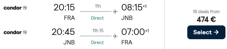 Condor verkauft Economy Class Flugtickets von Frankfurt nach Johannesburg bereits ab 474 Euro. Anreisen sind im Januar und Februar 2026 möglich.