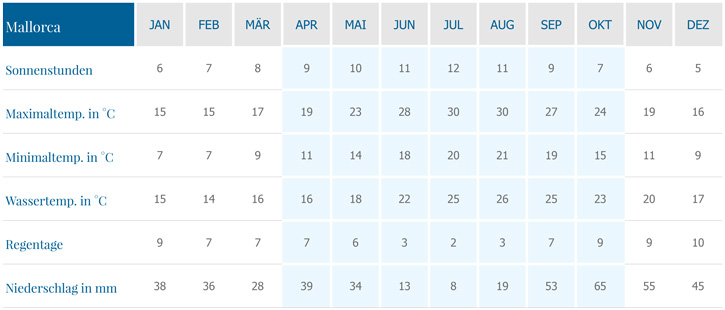 Das Mittelmeerklima auf Mallorca führt zu warmen Sommern und kühlen Wintern, die mit Durchschnittstemperaturen um 10 °C nicht übermäßig kalt sind. Im Juli und August kann es im Zentrum der Insel mit 40 °C und mehr hingegen sehr heiß werden. Wer nicht nur zum Baden auf die Insel reist, wird daher das Klima von April bis Mai sowie zwischen September und Oktober bevorzugen. Die Temperaturen sind nun angenehm warm und locken zu Landschaftserkundungen. Badeurlauber sind aufgrund der warmen Wassertemperaturen allerdings mit den Sommermonaten von Juni bis September besser beraten. Sehr schön ist auch die Mandelblüte, die ab Ende Januar beginnt. Allerdings kann es dann mitunter noch etwas kühl sein.