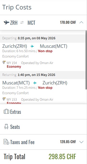Fliegen Sie mit Oman Air in der Economy Class von Zürich nach Maskat bereits ab 320 Euro. Verfügbarkeiten gibt es von Januar bis Mai 2026, es gilt ein Maximalaufenthalt von 3 Monaten. Aufgabegepäck ist im Preis inkludiert.