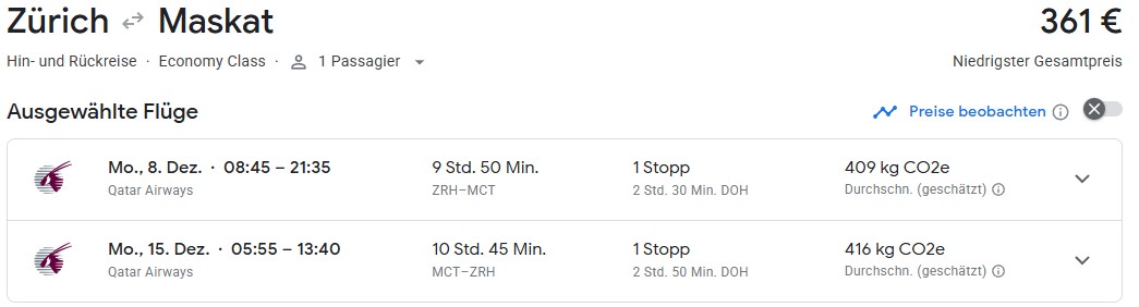 Qatar Airways verkauft bis 31. Oktober sehr günstige Economy Class Tickets von Zürich zu Zielen im Oman. Der Reiseantritt ist bis zum 30. April 2026 möglich und es gelten als Einschränkungen eine Vorausbuchungsfrist von 5 Tagen, ein Mindestaufenthalt von 5 Tagen oder einer Nacht auf Sonntag und ein Maximalaufenthalt von 60 Tagen. Diese Flüge buchen in der Buchungsklasse O ein.
