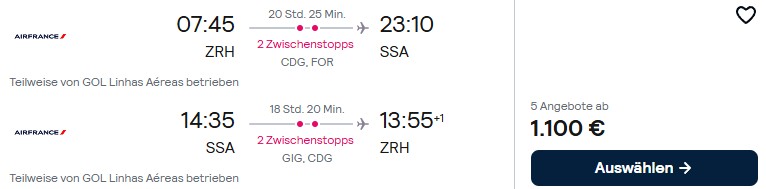 Bei Abflug in Zürich lassen sich aktuell sehr günstige Air France Premium Economy Class Flüge über Paris nach Salvador in Brasilien buchen. Verfügbarkeiten gibt es bei Abflug bis Ende Juni 2026 und es gelten als Beschränkungen ein Mindestaufenthalt von 3 Tagen oder einer Nacht auf Sonntag.