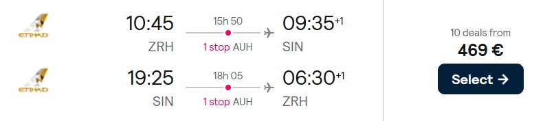 Etihad Airways bringt Sie im März 2026 ab 469 Euro in der Economy Class von Zürich über Abu Dhabi nach Singapur.