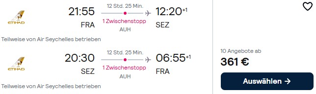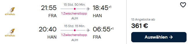 Hinweis: Aufgrund der aktuellen militärischen Auseinandersetzungen im Nahen und Mittleren Osten sind die lokalen Airlines, wie Etihad Airways, aktuell von Luftraumsperrungen betroffen. Es besteht also ein erhöhtes Risiko für Flugstreichungen etc. Etihad Airways bietet zusätzlich für Reisen bis zum 31. März 2027 eine einmalige Änderung des Reisedatums an. Es gelten aber Tarifunterschiede und dieses Angebot gilt nur bei Buchung auf der Seite der Airline und bis auf Widerruf.