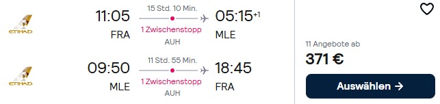 Etihad Airways verkauft bis 14. April sehr günstige Economy Class Tickets von Frankfurt und von München zu ausgewählten Zielen im Indischen Ozean und in Asien. Der Reiseantritt ist zwischen dem 01. April und dem 14. Juni 2026 möglich und es gelten als Beschränkungen ein Mindestaufenthalt von 5 Tagen und ein Maximalaufenthalt von 90 Tagen. Diese Flüge buchen in der Buchungsklasse E ein und sämtliche Preise wurden bei Probebuchungen Mitte Juni 2026 gefunden.