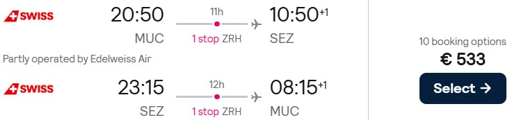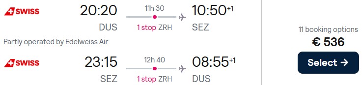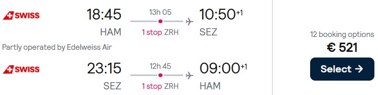 Bei Swiss lassen sich im Moment günstige Edelweiss Air Economy Class Flüge von Deutschland (Berlin, Hamburg, Düsseldorf, München) auf die Seychellen buchen. Verfügbarkeiten gibt es im Dezember 2025.