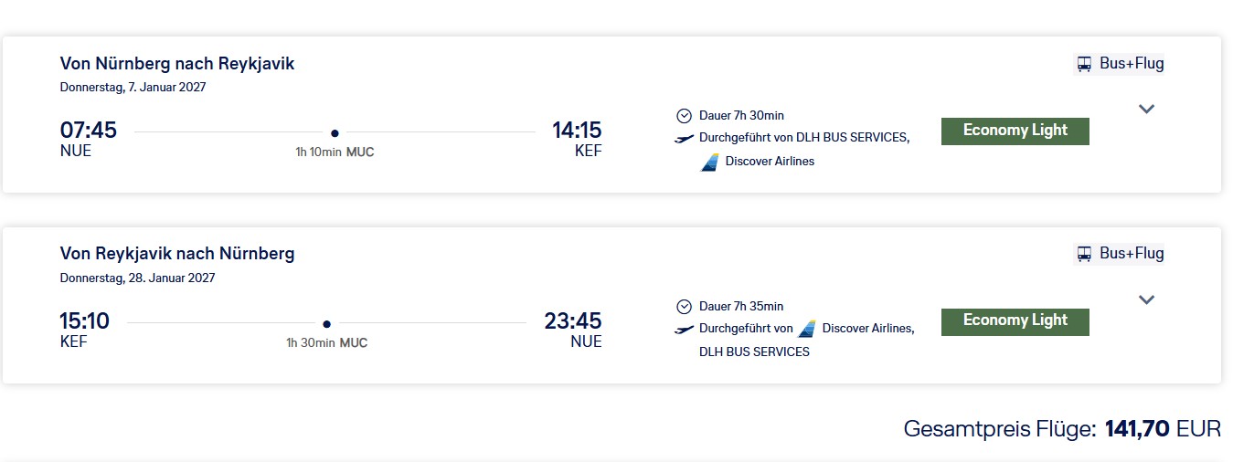 Fliegen Sie mit Lufthansa und Discover Airlines ab 141 Euro von Nürnberg nach Keflavik. Verfügbarkeiten gibt es im April 2026 und von Januar bis Februar 2027.