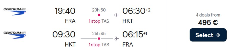 Fliegen Sie mit der usbekischen Airline Centrum Air in der Economy Class von Frankfurt nach Phuket ab 495 Euro. Verfügbarkeiten gibt es im September und Oktober 2026.