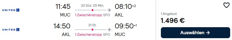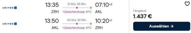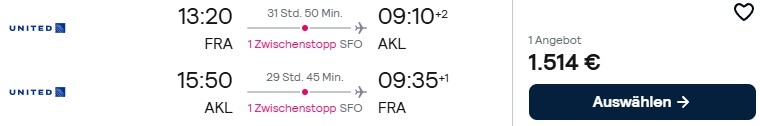 United Airlines verkauft im Moment interessante Economy Class Flüge von Deutschland und von der Schweiz über San Francisco nach Auckland. Der Sale läuft bis auf Widerruf und Verfügbarkeiten finden sich ab September 2026. Diese Flüge bucht die Airline in der Buchungsklasse K ein.