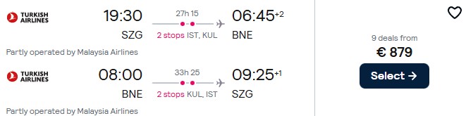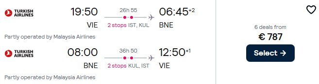 Turkish Airlines verkauft aktuell relativ günstige Economy Class Flüge von Wien und von Salzburg nach Brisbane. Verfügbarkeiten gibt es ohne veröffentlichte Beschränkungen zwischen Mai und Juni 2026. Genannte Preise wurden bei Probebuchungen vom 11. Mai bis zum 20. Mai 2026 gefunden.
