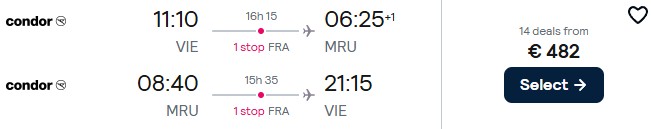 Mit Condor fliegen Sie im Moment schon ab 482 Euro in der Economy Class von Wien nach Mauritius. Verfügbarkeiten finden sich aber nur kurzfristig bei Abflug bis zum 05. Dezember 2025. Handgepäck ist inkludiert, aufgegebenes Gepäck wird zusätzlich verrechnet.